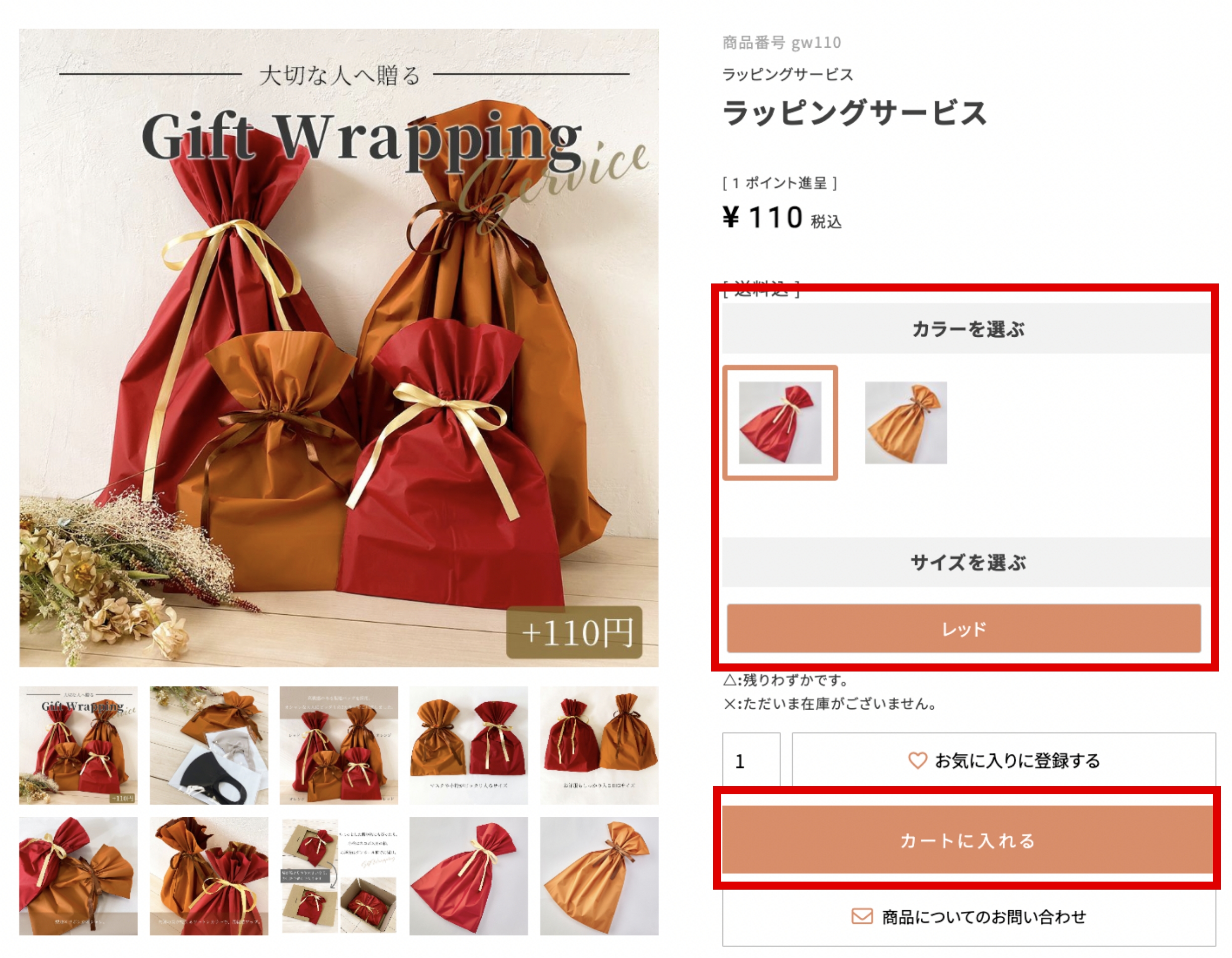 ラッピング商品ページで、お好みのラッピングカラーを選択し、カートに入れてください。